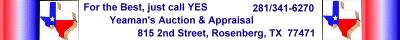 Y.E.S. Auction M.D. "Shorty" Yeaman Auctioneer, Texas License 10693 815 2nd Street Rosenberg, TX 77471 Phone: 281/341-6270 |